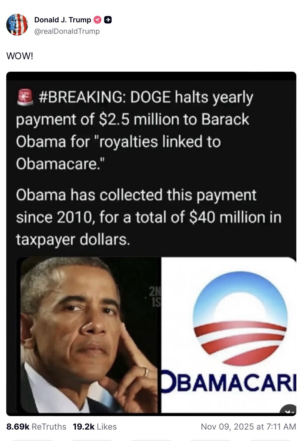 Donald Trump—a man with access to the best, most accurate information on basically any subject—posted to Truth Social a screenshot claiming that “DOGE halts yearly payments of $2.5 million to Barack Obama for ‘royalties linked to Obamacare.’ Obama has collected this payment since 2010, for a total of $40 million in taxpayer dollars.”