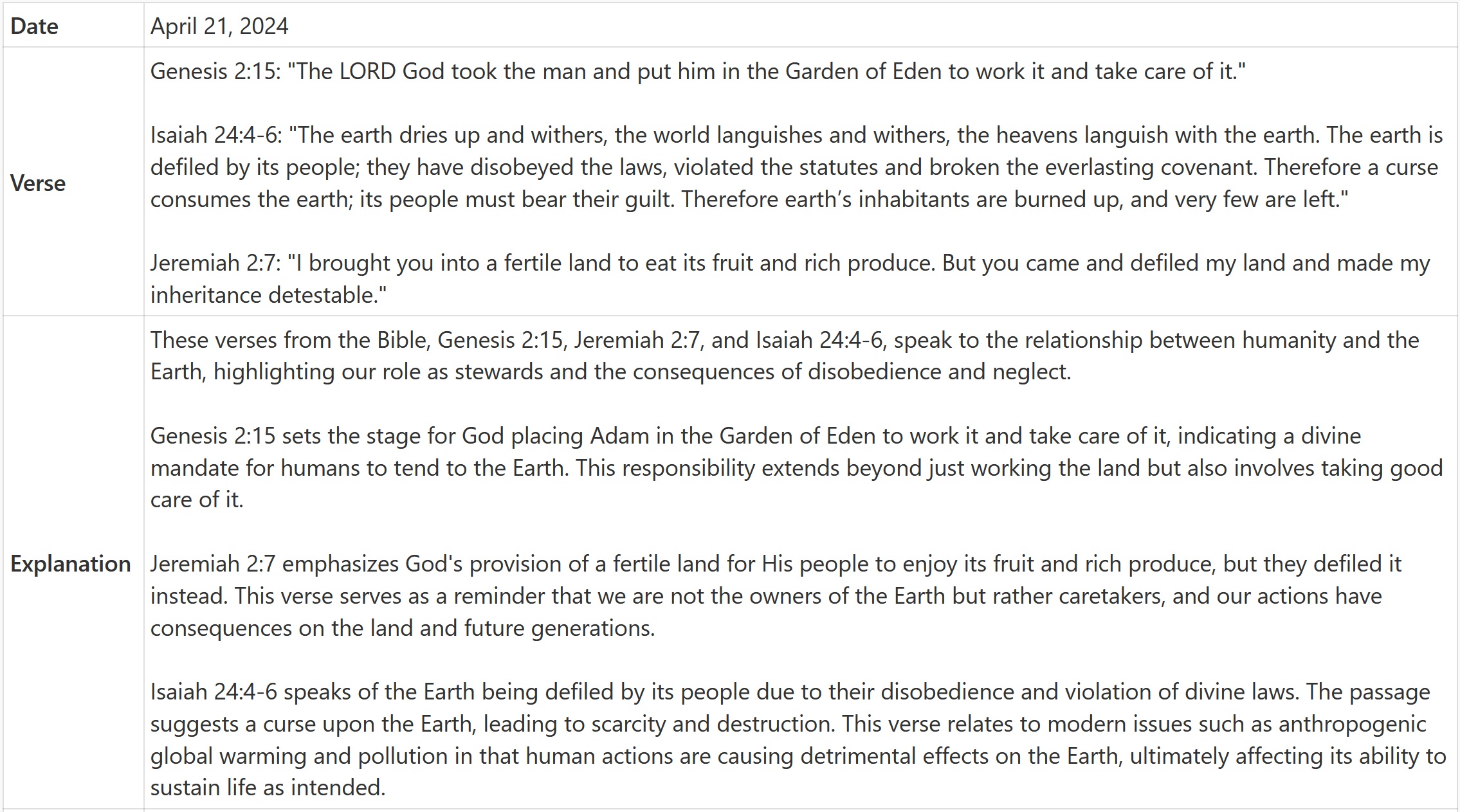 For Christians: The Bible talks about protecting our Earth and not defiling creation, as said in Genesis 2, Isaiah 24 and Jeremiah 2.