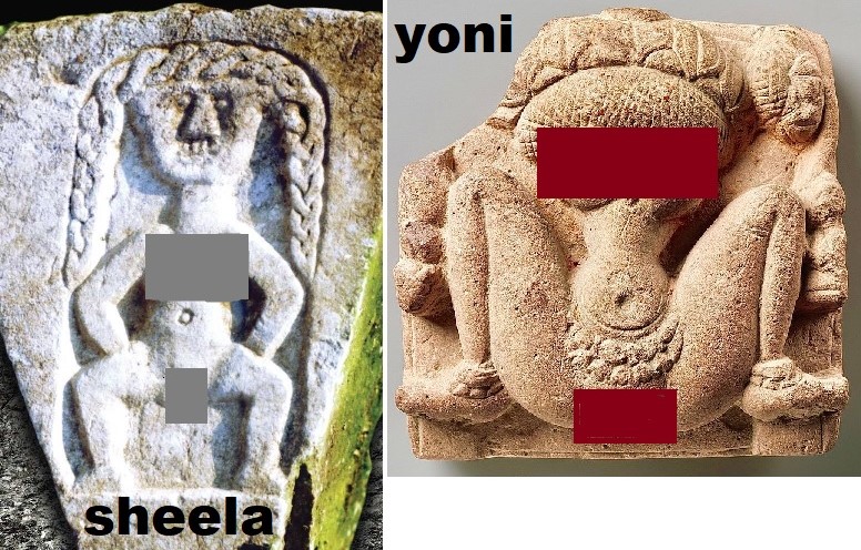 Okay; it gets weirder. So then, in the midst of this, I find out that the sheela-na-gig is similar to some figures found on Hindu temples in India and across south Asia, called yonis. Apparently, a yoni is a representation of the Hindu goddess Shakti, which deals, again, with birth and reproduction and female power and feminine prowess and so on. Evidently, the word yoni eventually became a common term for the human vulva/vagina. (I told you this was weird.) There are carvings on Indian temples of, again, females in childbirth positions, legs spread and the groin area exposed, somewhat similar to the sheela-na-gigs. Here are two examples, which I have toned down by blanking out the naughty bits:
