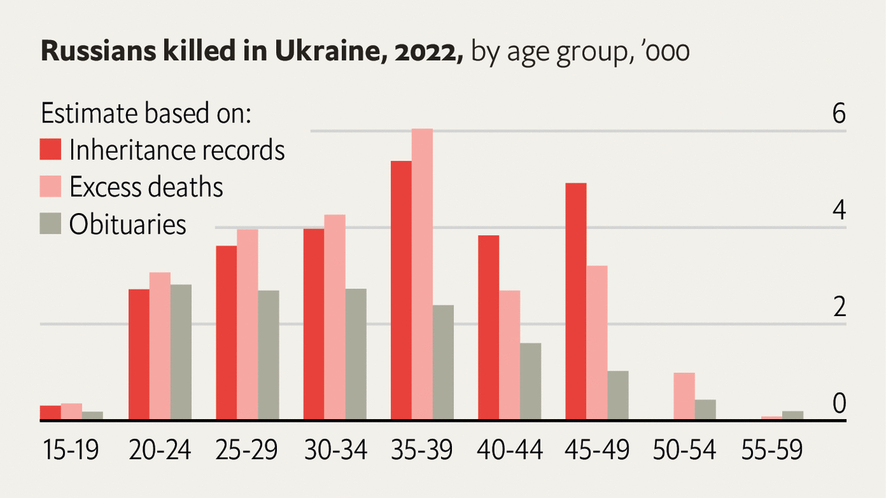 And Russian Stats (soldiers only) by the Economist, only for 2022. Putin is forcing a lot of youngsters my age (20s) to go to war for his greed.