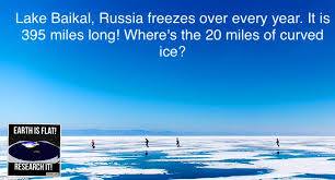 Lake Baikal in Russia freezes every year. It is 395 miles long! If the Earth were a globe the lake would curve up 20 miles in the middle but it is completely flat! The Earth is flat and stationary! If the Earth were a globe with a circumference of 24,900 miles, the curvature formula would be 8ins per mile squared, therefore, Miles Curvature Miles I Curvature __I I I I 16ft I 25 I416f Sins I 30 But we NEVER see any of this ridiculous curvature!​