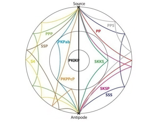 This supports the hypothesis seismic energy from a major meteorite impact would disrupt the surface on the opposite side of the Earth. The different types of wave phases are shown below. In a perfectly spherically symmetrical structure, waves arrive simultaneously from all directions and focus exactly at the antipode.