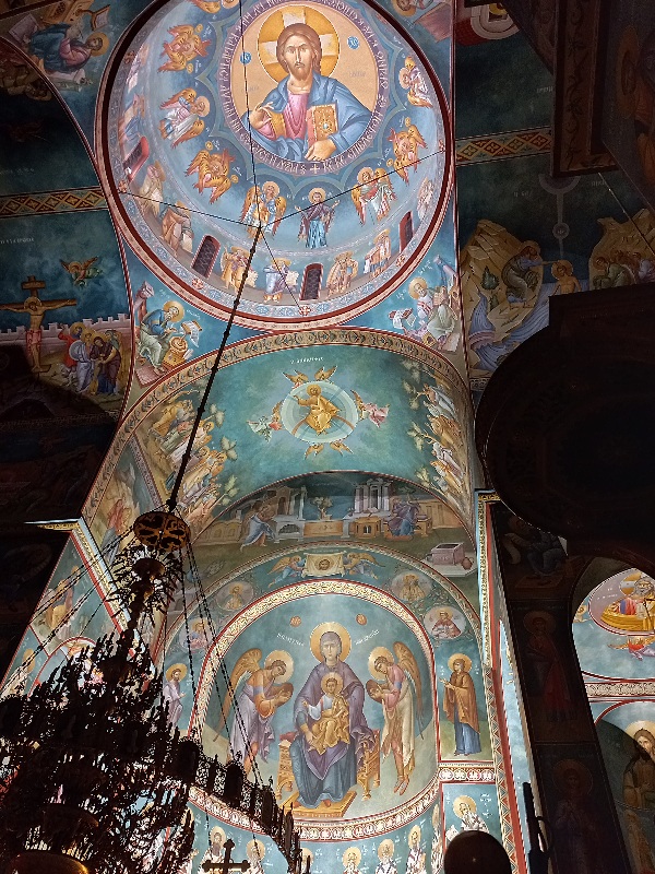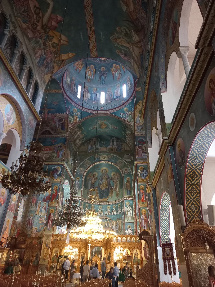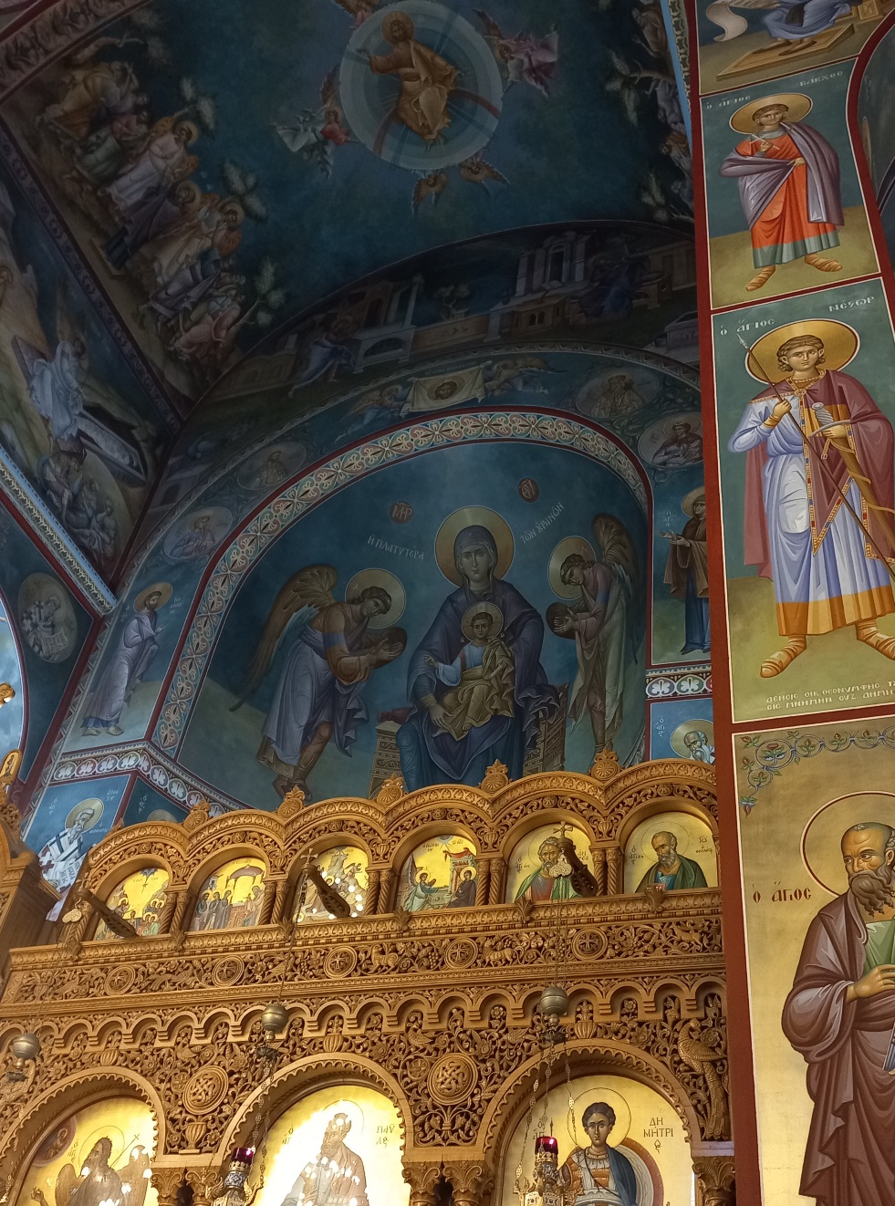We were incredibly blessed to discover a relatively new church here in Thessaloniki, a 30 minute walk from where we are staying, dedicated to the Dormition of the Theotokos. We came for a vigil service a few days (nights) ago and then again for the feast day. The church is huge and is absolutely beautiful inside. There are still a few walls, columns and ceilings that have yet to be frescoed but the bulk of the church is already finished. We were in tears the first the we walked in.