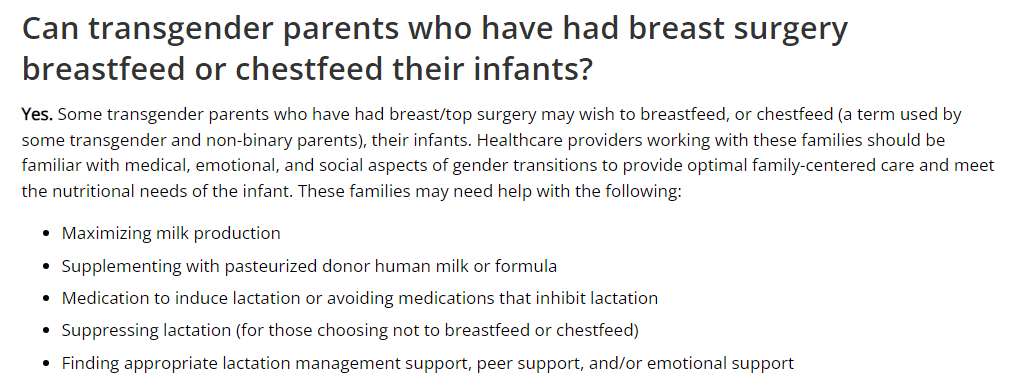 Critics on the right accused the center of seeking to appease the transgender lobby by promoting medically inaccurate information, arguing that biological males cannot nurse babies no matter how they identify.