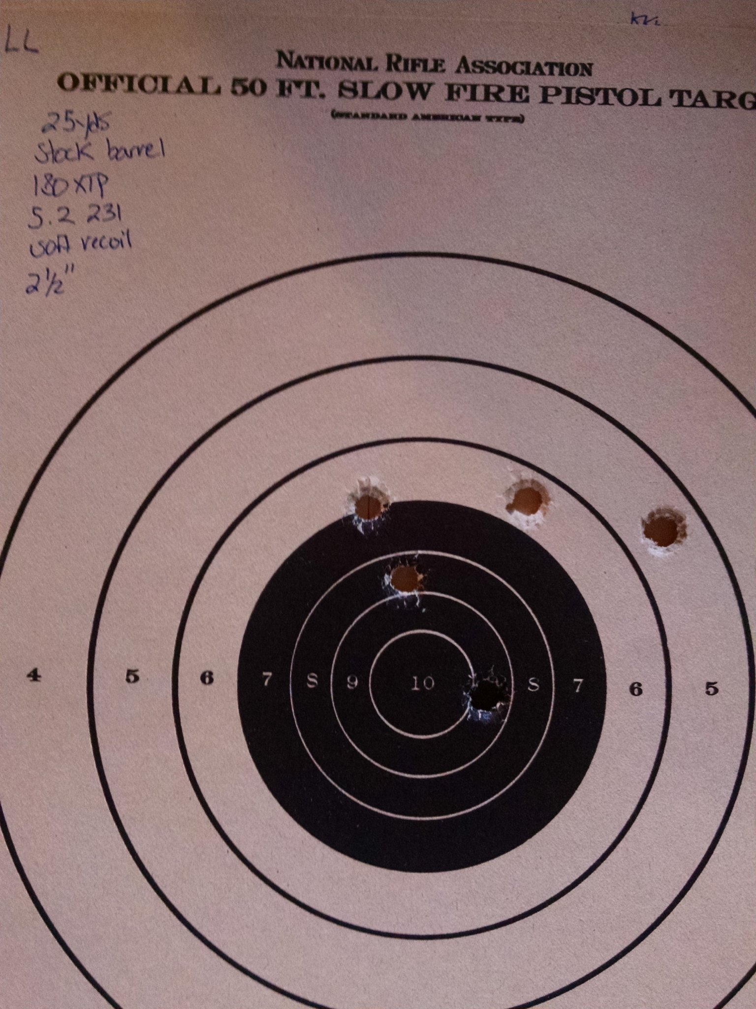 Getting closer. 5.2gr of W231 behind a 180gr Hornady XTP is getting me closer to 2" or better at 25yds and is very soft shooting.