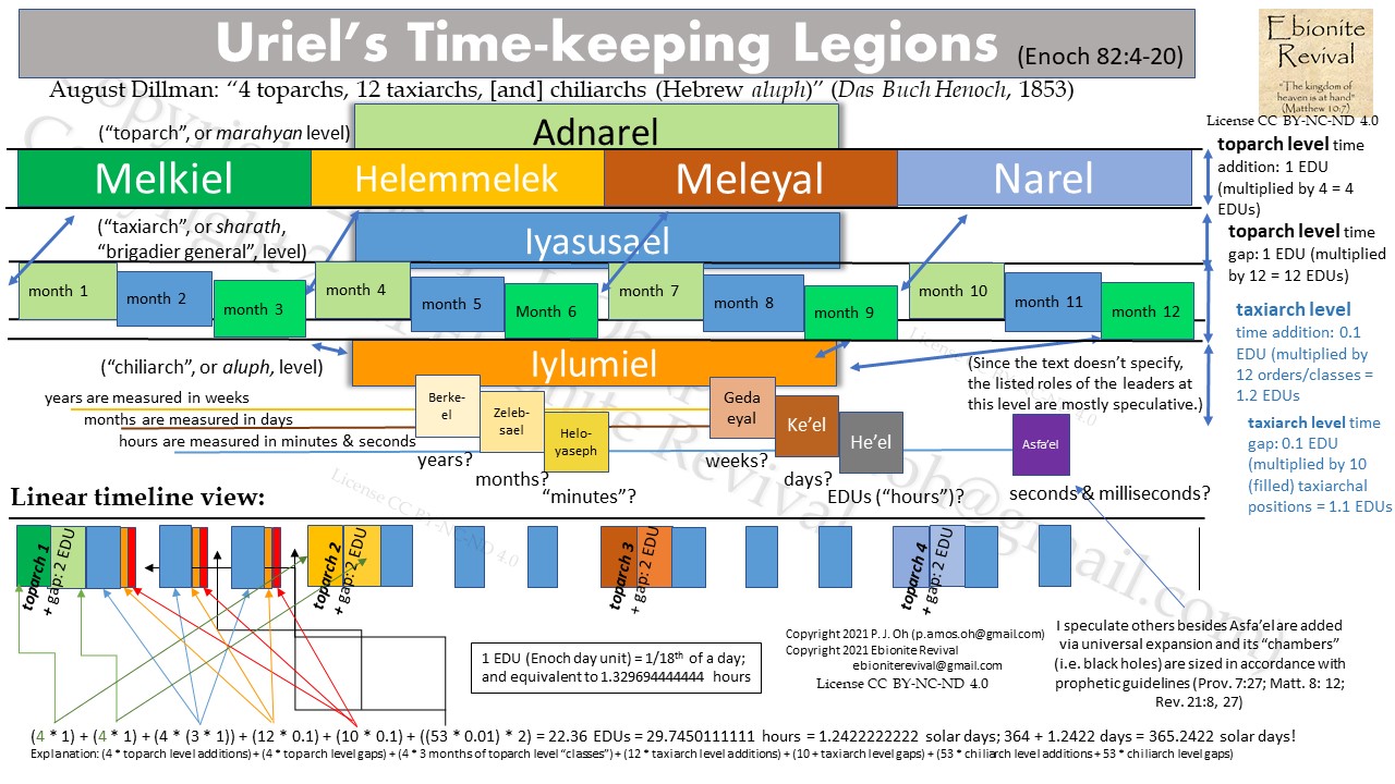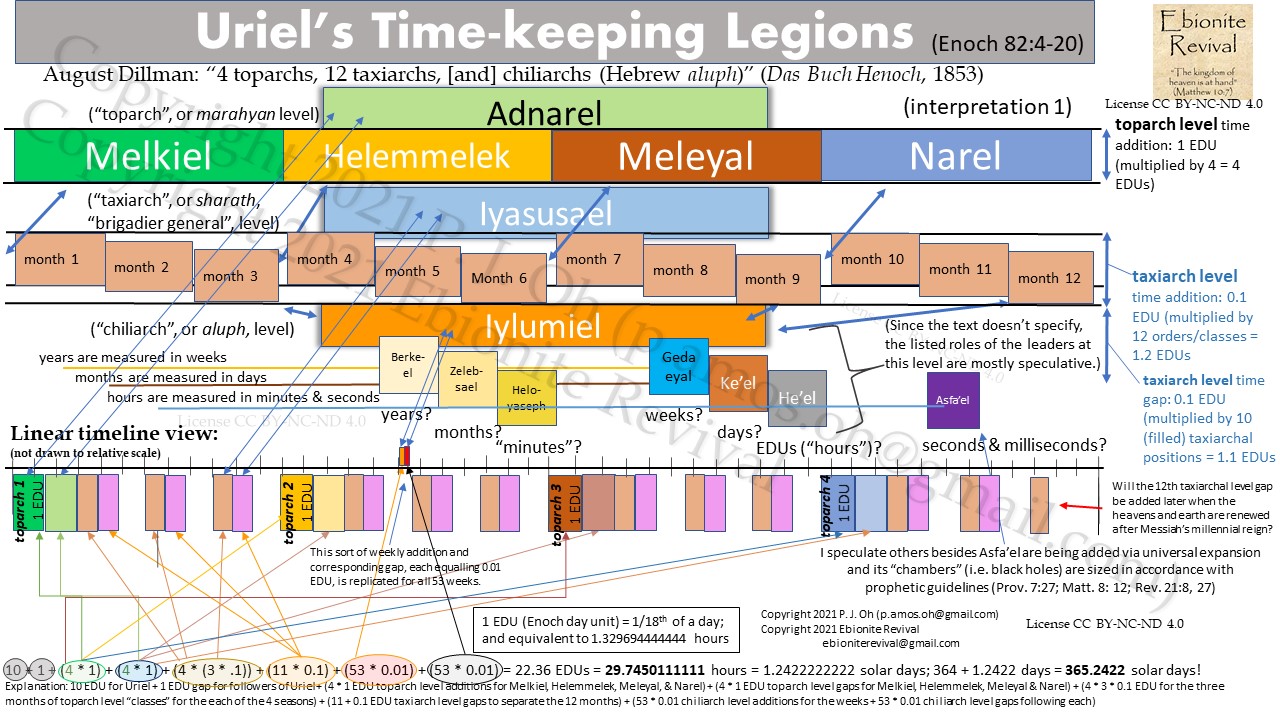 Next, we multiply 1 EDU by four so that we can see how many hours accrue on top of each season on account of the four "leaders" named "Melkiel, Helemmelek, Meleyal, and Narel" (Enoch 82:13; Knibb & Ullendorff, 1978, pp. 189–190).