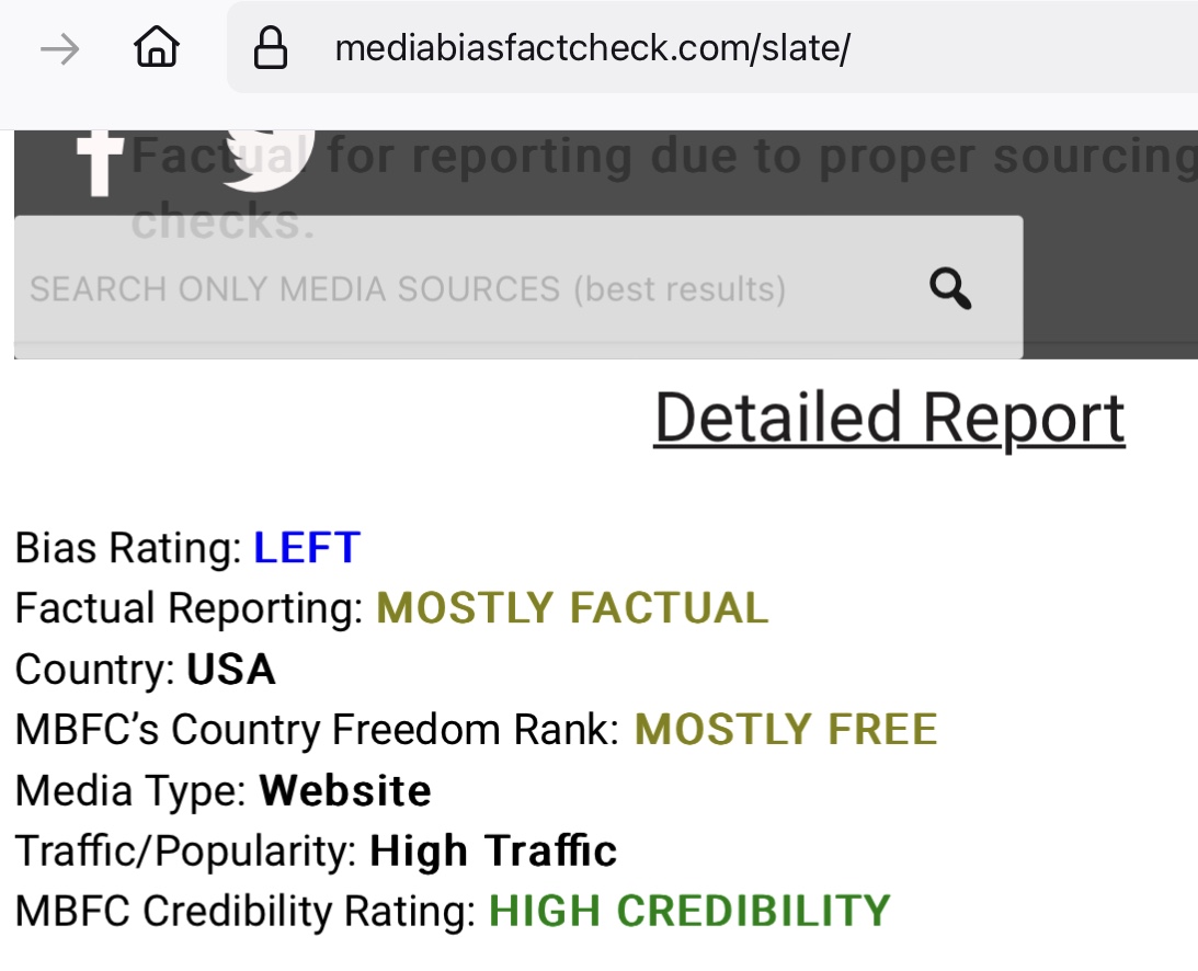 • Overall, we rate Slate, moderately Left Biased based on story selection and editorial positions that favor the left and Mostly Factual for reporting due to proper sourcing but a few failed fact checks.