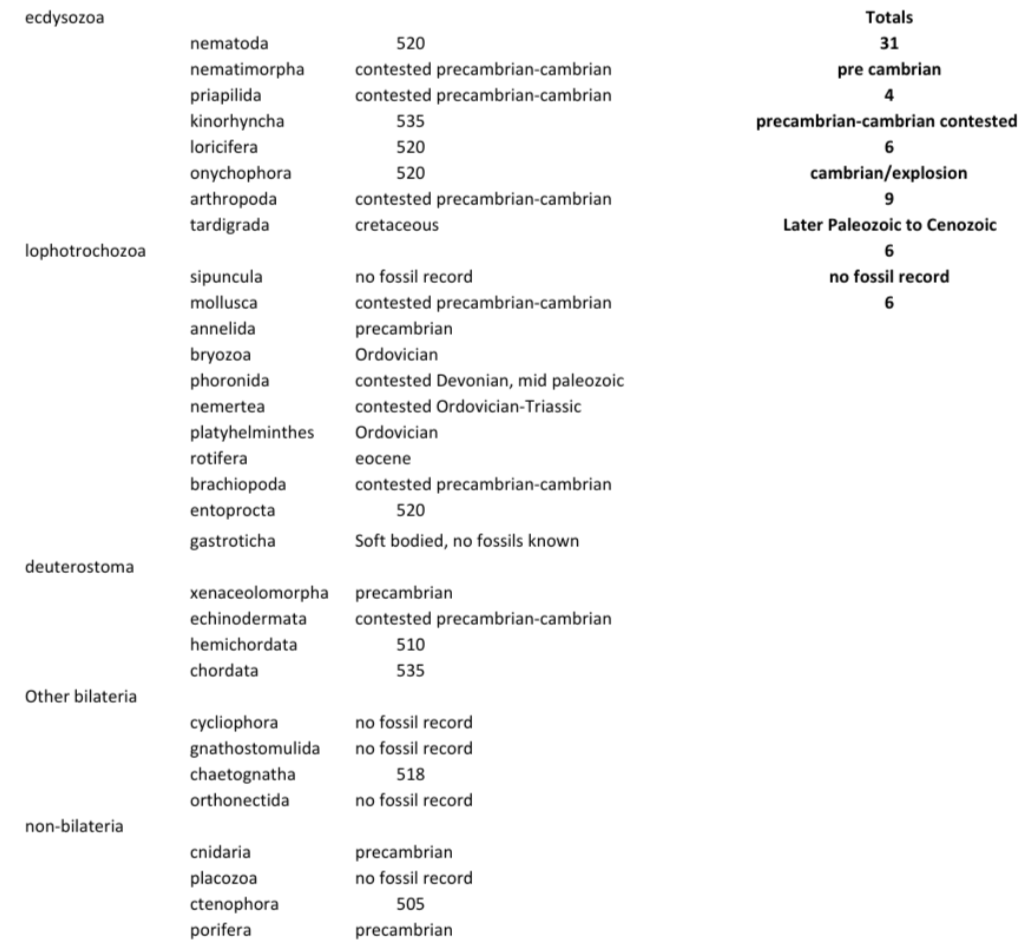 Meanwhile, outside of bilaterians, cnidarians, annelids, mollusks, sponges etc. All have been found in fossil form before the Cambrian in more recent times. Though Darwin, in his time, never knew of such fossils. But as time goes on, we continue to find more and more, and the so called Cambrian explosion, which was once thought to be instantaneous, has gradually expanded to tens of millions of years with more and more precursors identified beforehand in the precambrian.