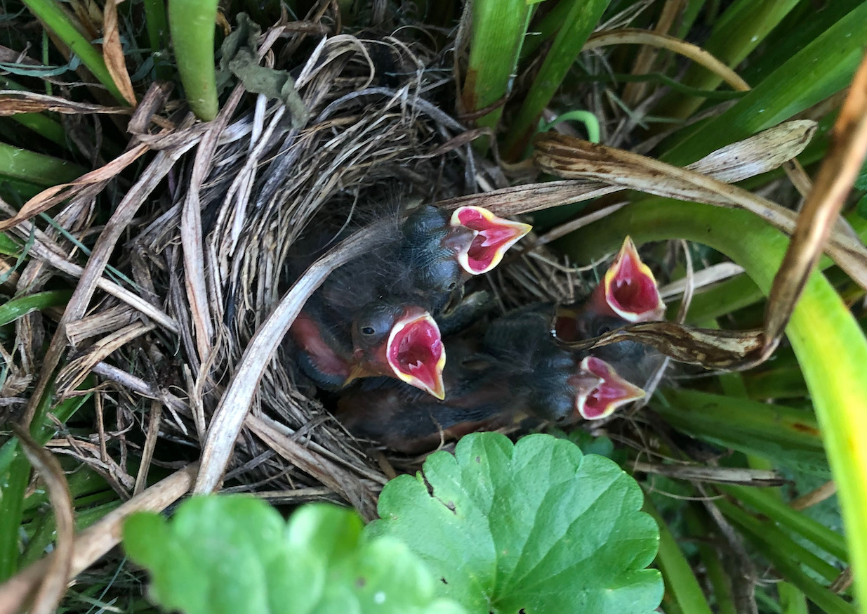 July 12th, as I was weeding the blueberries, I stumbled on to this little nest...with 4 little blue eggs. This afternoon, I went back to check on it, to see if the eggs had hatched...and here were these four little Baby Birds all asking me for some diner!
