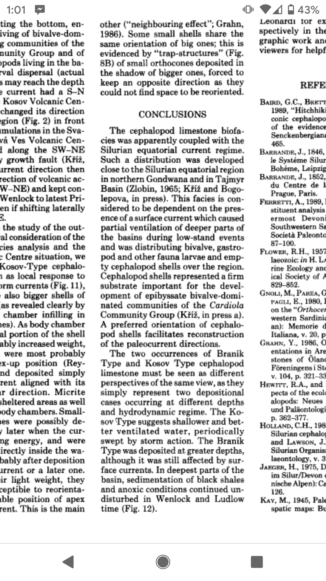 And it's kind of the same theme paper after paper. Similar lithologies, similar shallow marine fossils, a lack of terrestrial fossils or features, often these papers are distinguishing between oxygen rich and oxygen poor marine environments. And they continually suggest the same details. The shellfish dies, orthoconic nautiloids float with their anterior side down. They sink to the bottom and fill with sediment.