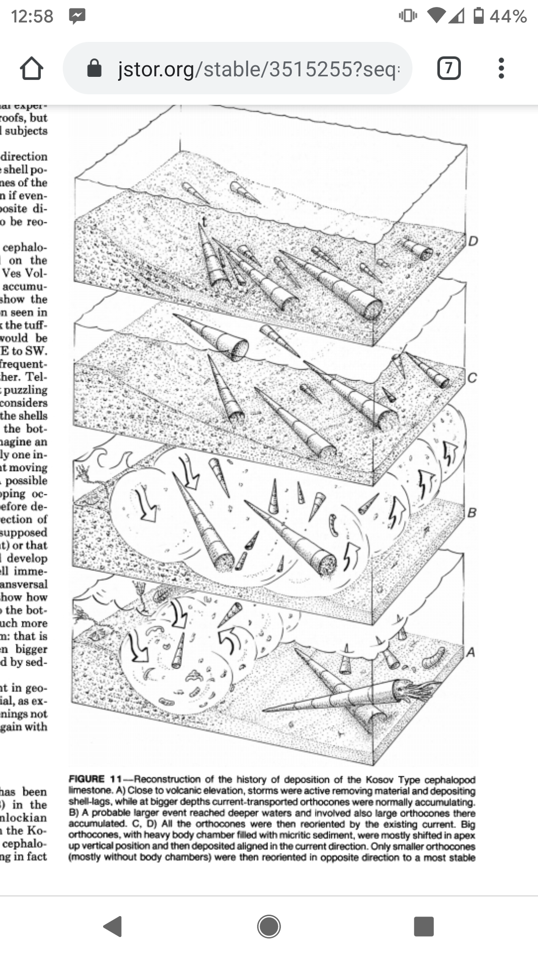 With that, I don't think there is any reason to believe that shellfish, should never be buried at an angle, be it an elongated ammonite, or a pencil shaped nautiloid. Especially if models indicate that nautiloids can also float and sink in a vertical position. It's simply a matter of the current not overtaking every single shell.