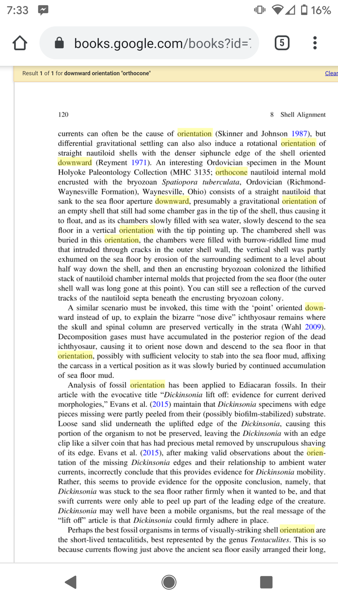 It's basically the same thing article after article, for shellfish of various species, here in the article above "the disparity may be explained if the orthocone was colonized by brachiopods during it's life, then after death it sank to the seafloor where it rested obliquely. This apical bouyancy could have been caused by entrapment of bouyancy gases or gases produced by soft-part decay."