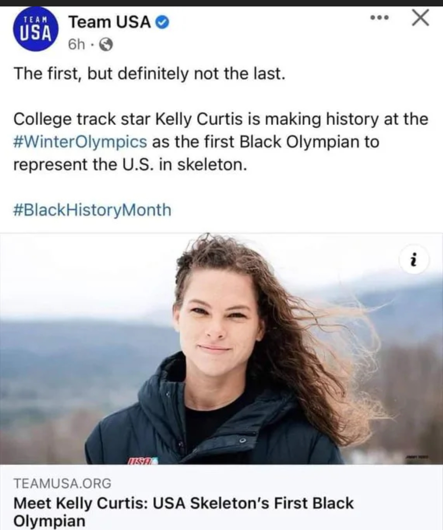 Happy Black History month everyone! No...this is not a joke. Yes, the first "black" skeleton Olympian is not black at all. Notice how every news outlet, to include Fox News, is going along with it. Can someone please tell me what is going on in this clown world? I would really like to hear from progressives. Will Biden nominate someone like her as the first "black female" Supreme Court justice?