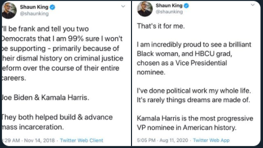 For instance, if you look at what Shawn King had to say about Biden/Harris not long ago compared to now...