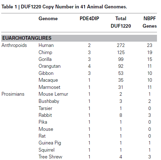 Found an interesting paper on human brain evolution and the possible role of DUF1220 copy number. They argue that the expansion of the number of genes with the DUF1220 protein domain is strongly correlated with brain size and intelligence. Here is a snapshot of one of the figures: