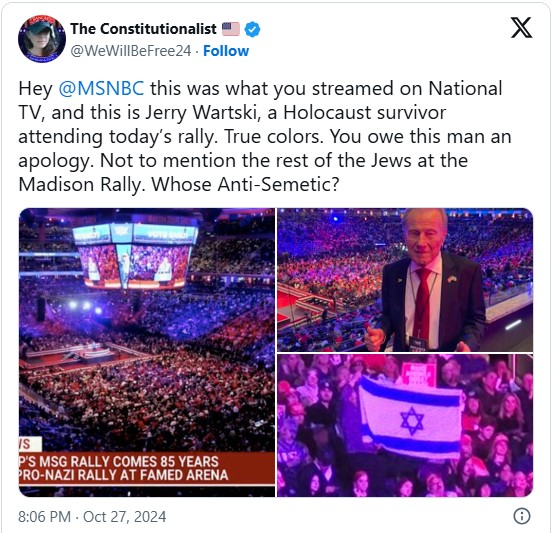 “Hey @MSNBC this was what you streamed on National TV, and this is Jerry Wartski, a Holocaust survivor attending today’s rally. True colors. You owe this man an apology. Not to mention the rest of the Jews at the Madison Rally. Whose Anti-Semetic?” one user questioned.​