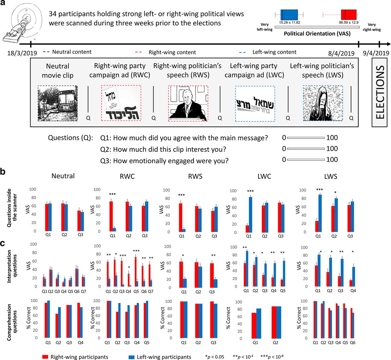 The bar plots in blue and red compare the responses of extreme left-wing (blue) vs. extreme right-wing (red) participants.