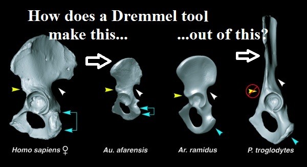 And what about Lucy? Well, Creationists, based on the stupid Hovind inspired Chick Tract "Big Daddy" claim that she was a chimpanzee (when they don't ignorantly claim she was an outright fraud). They often cite Owen Lovejoy using a small cutting drill to fix her pelvis that was fossilized in an unnatural position as "proof" that she was just a chimp. To them I ask this: