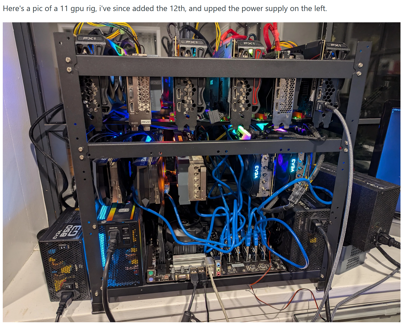 I have trouble seeing how he can justify 12 x 3090 GPUs? (but it does help to explain 4 x power supply)