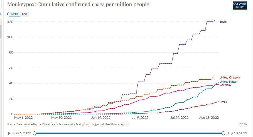 Here is the per million case numbers, but in the linear display. I think the US is actually still quite a bit behind Spain in that regard, but the trajectory is still bad.
