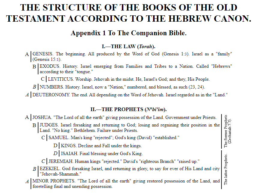 God through His Holy Spirit has certain styles of writing which He ordered in the Hebrew Bible precisely as He intended. English Bible versions of today are mixed up and out of order in their ordering of the Old Testament, this includes the Catholic Bibles which even go so far to add to the Hebrew Canon set forth by the Holy Spirit of God. Even Jesus speaks in the same style as follows from John 8:47 quoted from the Douay-Rheims Version(Roman Catholic) 1899, the style is called introverted parallelism which matured to being called Introversion of Correspondence. The lettering A, B,