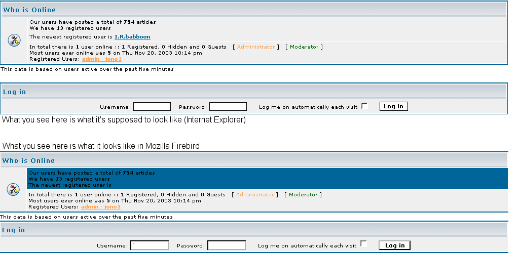 Hmmm I'm looking at my PHPBB forums and they look and function the exact same with Mozilla on Linux compared to IE on my XP. I'm not running firebird though. But I do know that certain web codes do not run the same on Mozi as it does with IE, if at all. I use them both though, as with many other things as well... well w/o add banners of course :p I think I have Mozi for Windows but I never run it with the adware junk and I'm not shelling out cash to get rid of it. I'm not that big into web browsers.
