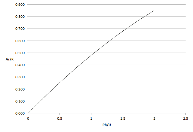 Now, can you tell us why a different state past could not produce a 1.5 ratio for Pb/U and a 0.1 ratio for Ar/K? That would be far away from the line and would falsify a same state past. So why shouldn't we see data points from real world data that falls all over that graph instead of along that line connecting the points?