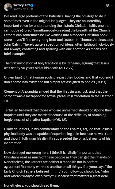 Wesley Huff has written a post on the variegated beliefs among early Christians that contradict one another, making the point that we have to be critical and discern what we read among these early teachers. I have 3 points I'd like to make in response, numbered below.