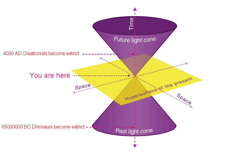 The area inside the past and future light cones is where the universe is "time-like" and the trajectory of objects in spacetime with mass such planets, stars, galaxies even creationists are confined and travel at less than the speed of light.Just because I'm curious, in the diagram, does the plane 'hypersurface of the present' travel with you as you ascend?