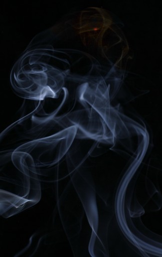 The smoke seems to naturally rise in two columns, or perhaps it rises in a single column and only appears as doubled-lines because of the angle of the flash. After taking some tranquil, flat-images, I opened the windows to get it coming out more rippled, then took three photos (okay I took a hundred and fifty photos, but chose three :) ) which I opened in PhotoShop to combine and add a bit of colour, like the receeding lines on distant mountains (I hope, at least).