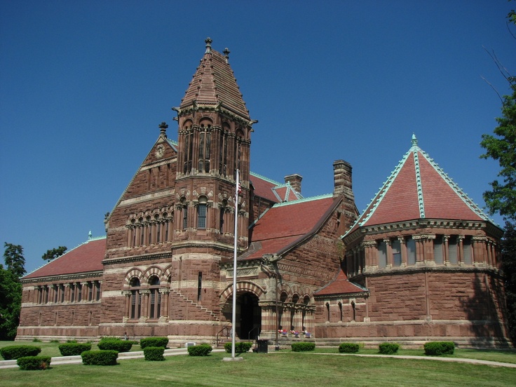 I've always been intrigued by Richardsonian architecture - a revival of the Romanesque style, based on Henry Hobson Richardson's interpretation. This style usually featured thick, varied masonry walls / facades; asymmetrical masses; short columns; cylindrical (or sometimes square or polygonal) towers with conical roofs; and round Roman arches. Many buildings also included red sandstone and green roofs.