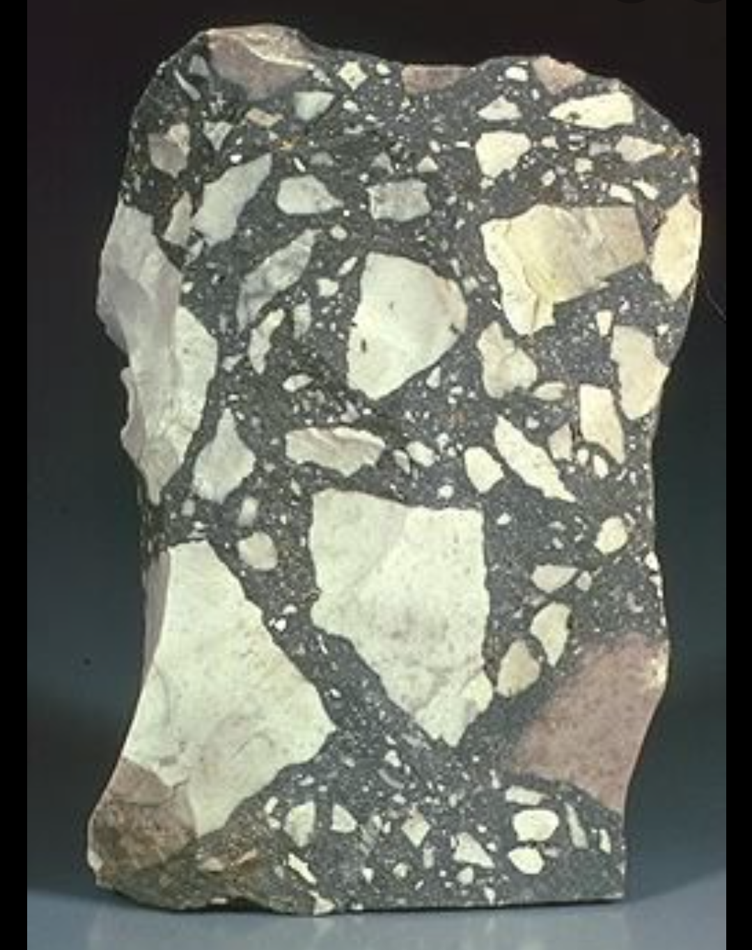 Brecciated fault gouge is also very common in the angular unconformities. Breccias associated with these unconformities being angular fragmented jumbles of deposits caught between two crushing massive bodies of rock.