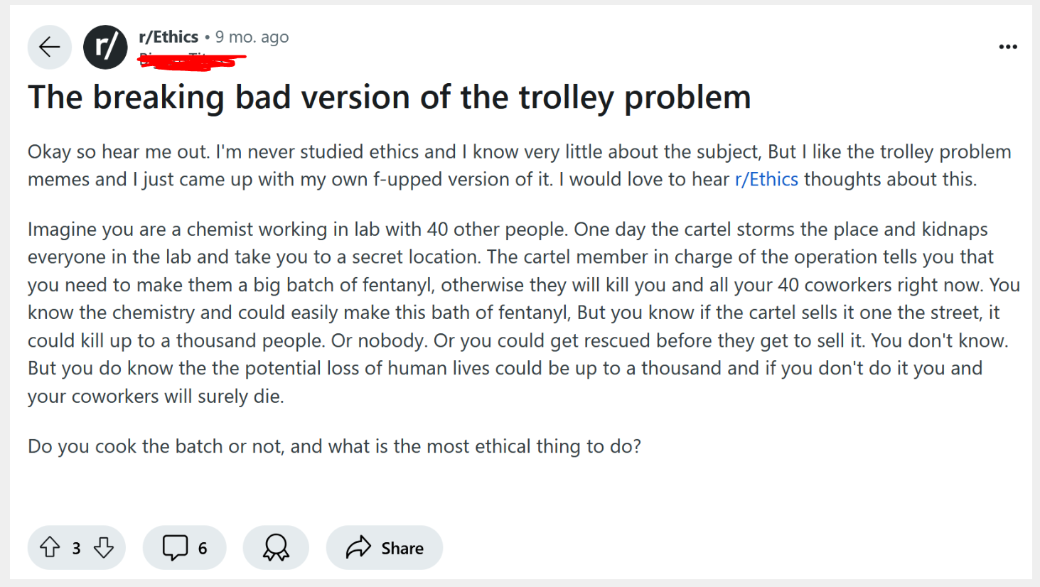 Someone asked the Breaking Bad version of the trolley problem on Reddit: