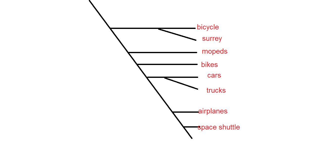And your order is not unique. Someone else could easily switch your mopeds/motorcycles with surreys. Now vehicles split first on number of wheels, and then both paths independently split with a convergence on engines. So which split is first? The number of wheels or the presence of an engine? This one fact ruins the coherence of your tree.