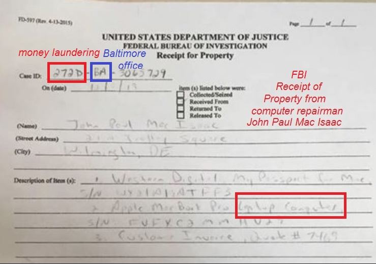 The pieces of paper are receipts from the FBI for taking possession of his laptop.