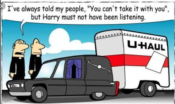 When told that he 'can't take it with him' the greedy old man sat up in his death bed and declared, "If I can't take it with me...I ain't going!"