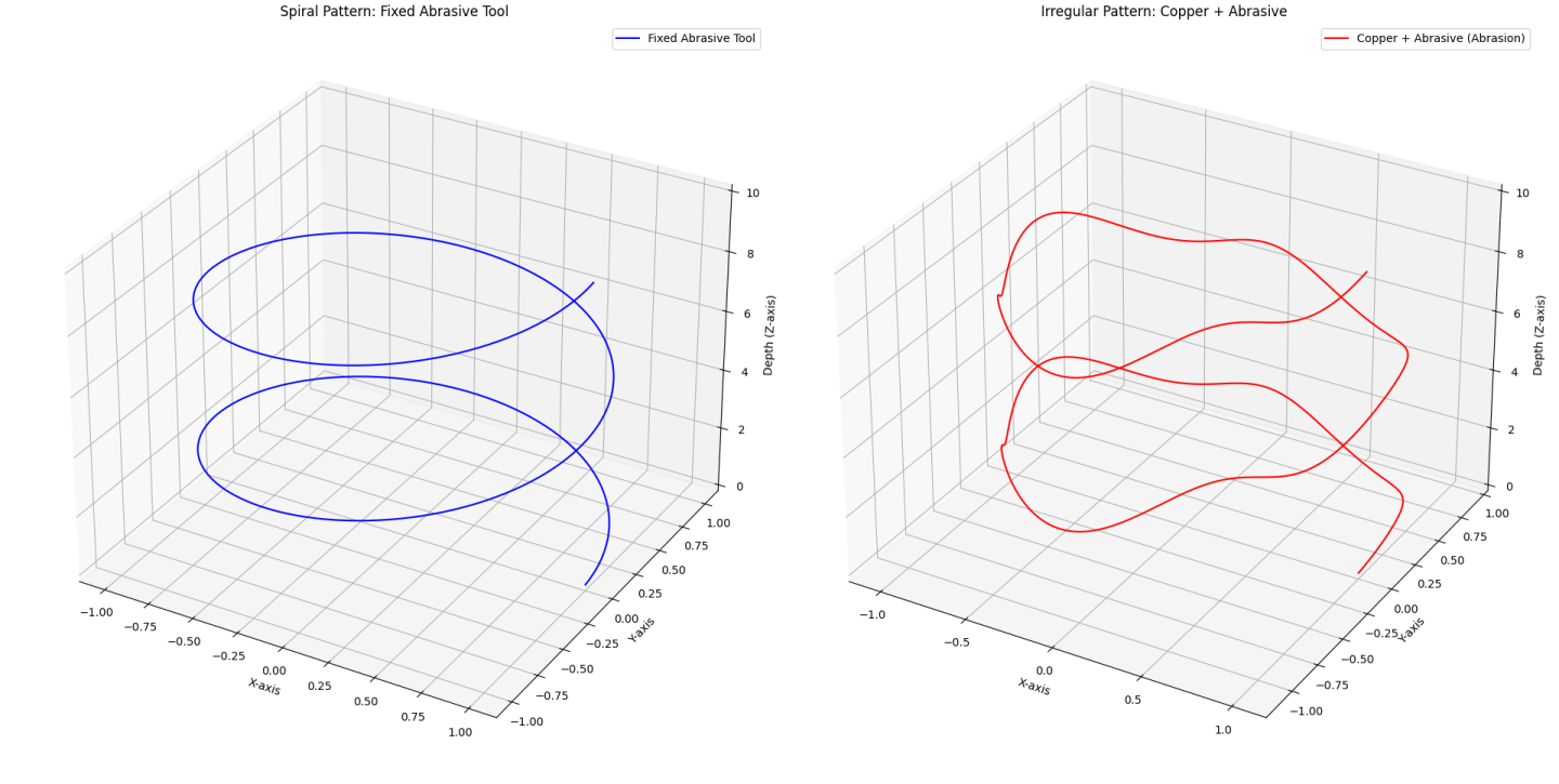 As expected the fixed tool produced a spiral pattern of a constant pitch, while the copper and abrasive produced an irregular pitch.