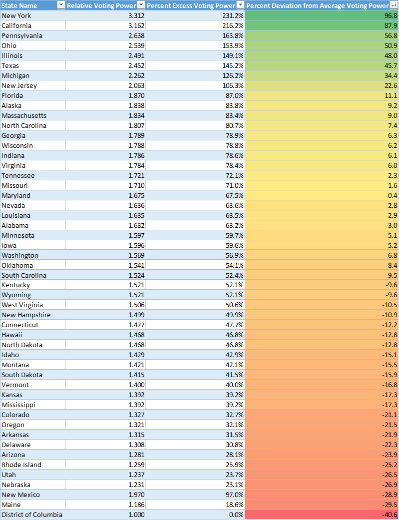 The paper was titled that because they discovered that a voter in New York state has 3.312 times the voting power of a citizen in another part of the country. The popular argument in favor of the current electoral college system is that the inequality favors residents of less populous states, which this analysis will show is false. The electoral college actually weakens the voting power of residents of less populous states and strengthens the power of those in more populous states.