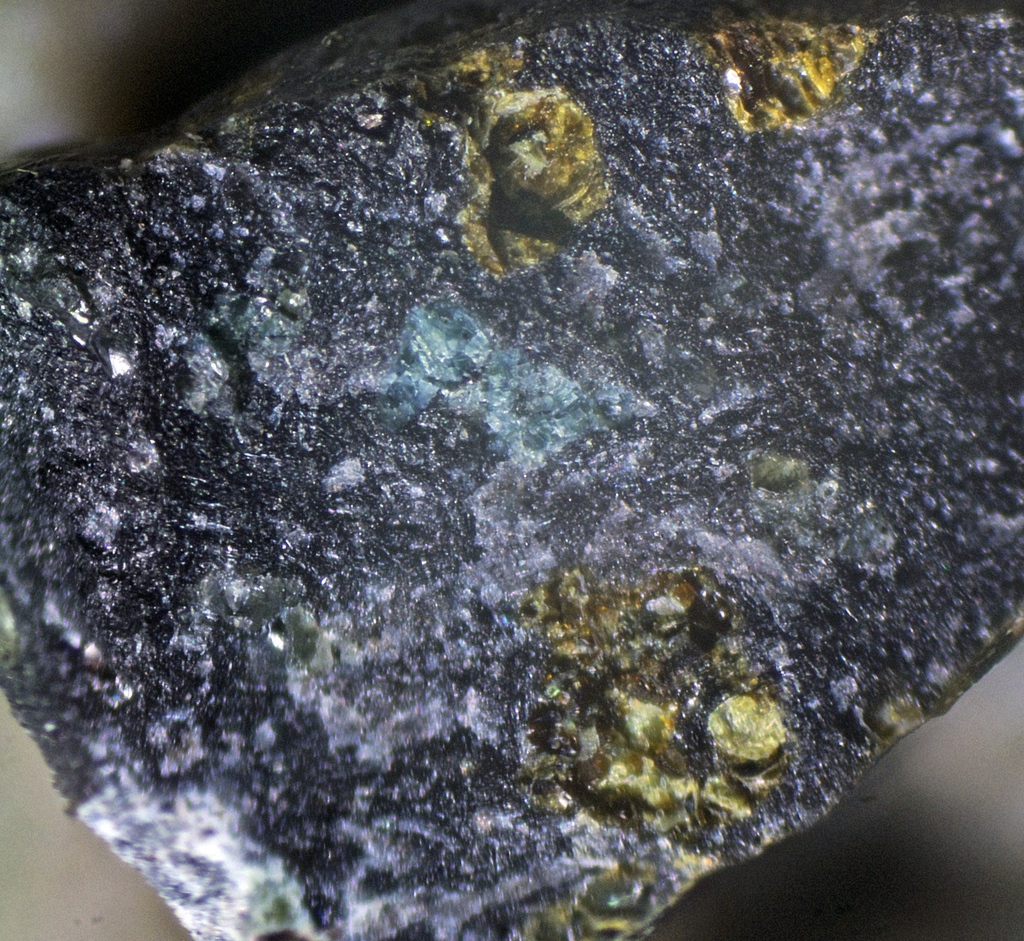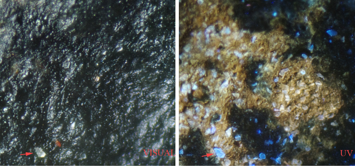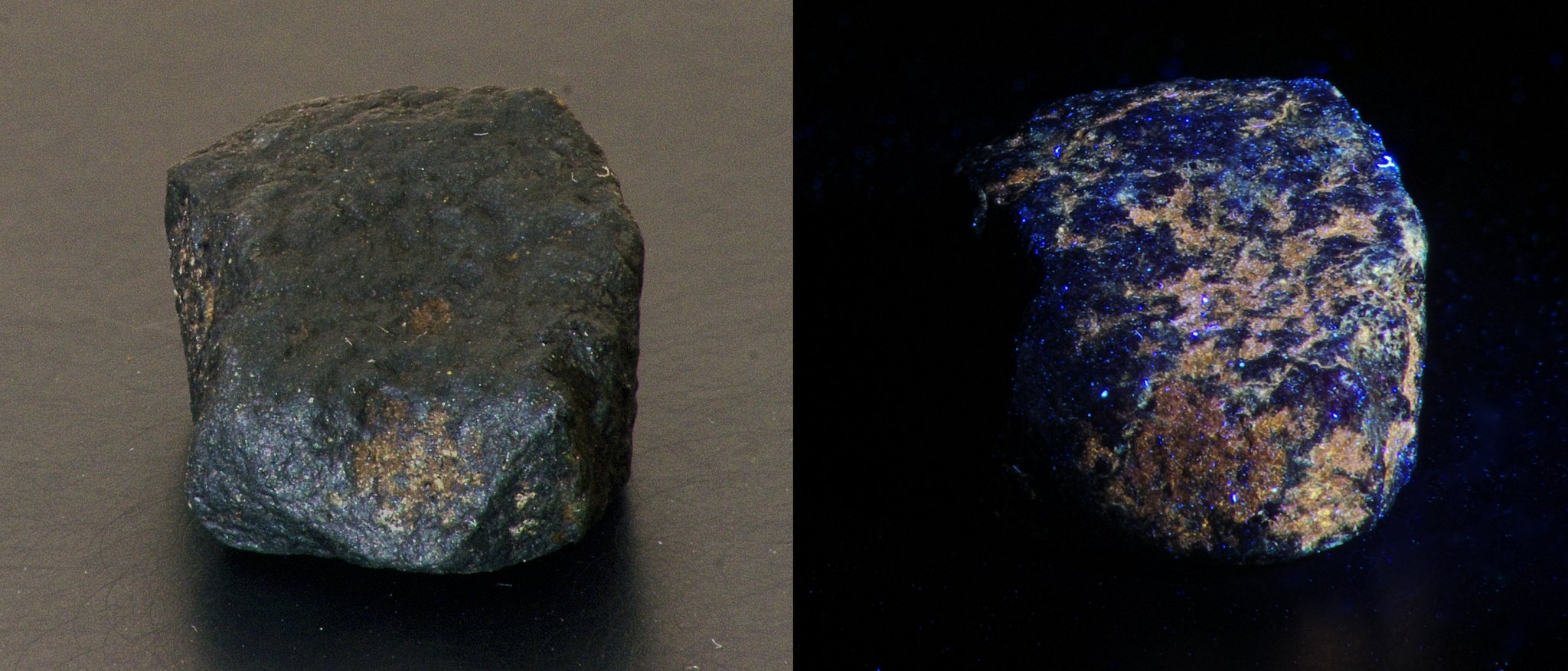 My first impression was the sample was a carbonaceous chondrite meteorite and the fluorescence was due to organic compounds in the matrix.